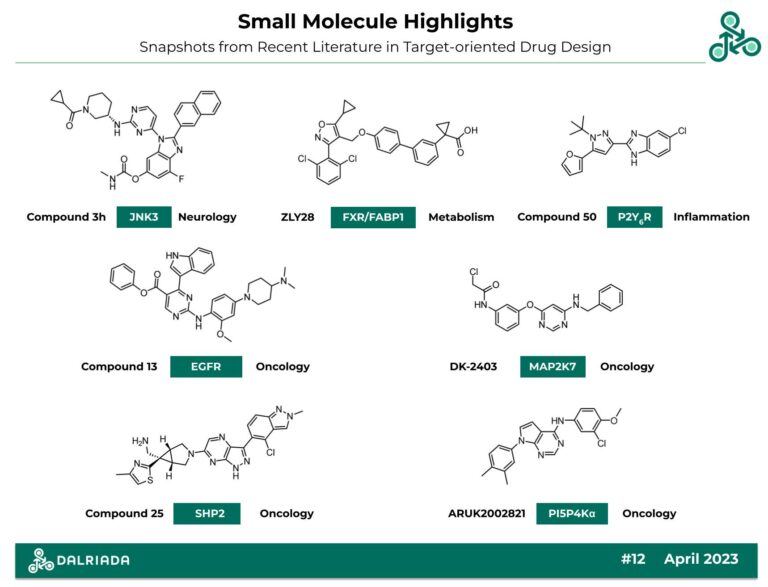 In this issue of Small Molecule Highlights, we bring you 7 new small molecules, fresh off the press! These compound target a diverse set of proteins (including JNK3, FXR, FABP1, P2Y6R, EGFR, MAP2K7, and more), along with utilizing interesting structural motifs: N-monomethyl carbamates, chloroacetamide electrophiles, and bicyclo[3.1.0]hexane rings. From a medicinal perspective, these molecules have been developed to target a wide-ranging list of therapeutic areas, including neurology (e.g. Alzheimer’s Disease), oncology (pediatric T-cell acute lymphoblastic leukemia), and inflammatory diseases (e.g. colitis).